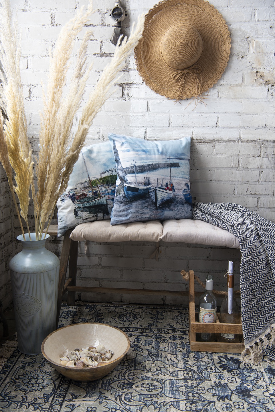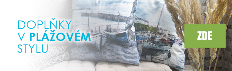 Polštáře s motivem lodí jsou skvělým doplňkem pro pohovku nebo křeslo a přidávají do místnosti hravost a originalitu. Světlemodrá váza se sušenými květinami nebo větvemi přináší svěží a letní pocit do prostoru, zatímco slamák pověšený na zdi dodává náladu plážového stylu. Ten navíc nemusí být jen dekorací – když přijde léto, využijete ho i jako módní doplněk!