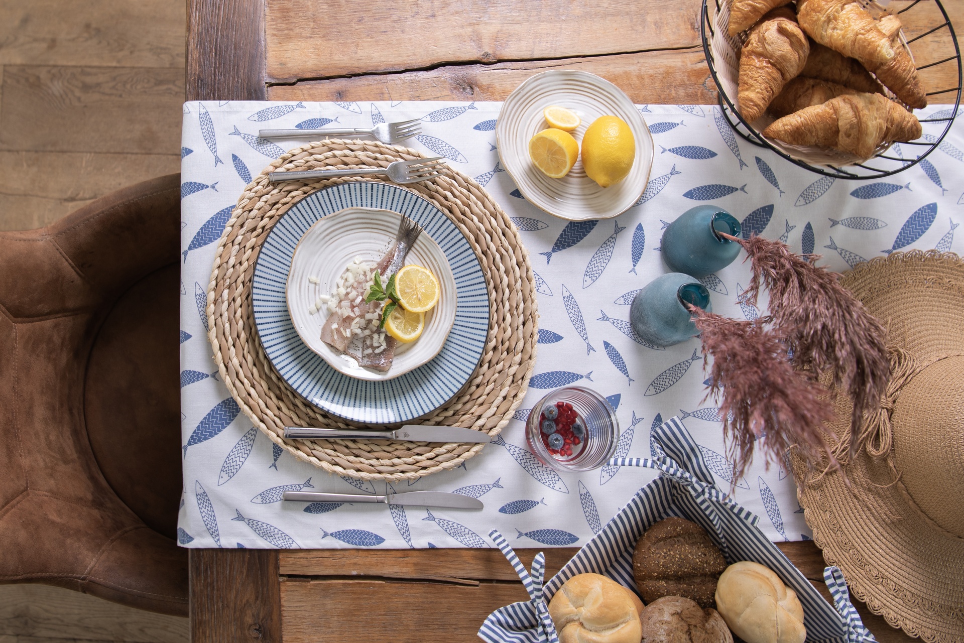 Prostírání s motivem modrých rybiček je hravé a osvěžující a dokonale zapadá do plážového stylu. Doplněním prostírání z mořské trávy přidáte přírodní prvek a získáte pocit lehkosti a uvolnění. Porcelánové nádobí v tónech bílé a modré dokreslí celkový vzhled prostřeného stolu. Naprosto ideální volba pro servírování pokrmů z mořských plodů a dalších receptů, které jste si oblíbili na dovolené.