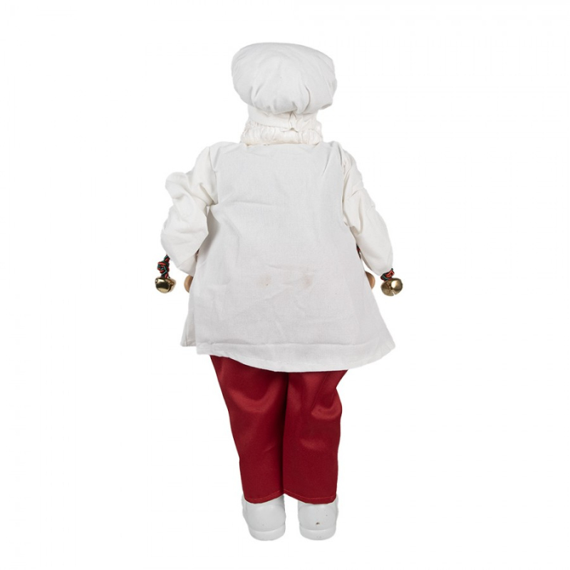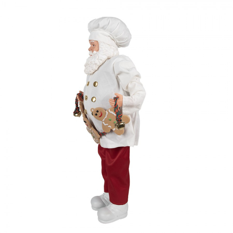 Bílá vánoční dekorace s motivem Santa Claus s červenými kalhoty držící řetěz se třemi perníčkami je elegantní dekorací, která připomene ty nejkrásnější chvíle svátků. Tradiční vánoční motiv se stane středem pozornosti každého prostoru. Rozměr 50 cm je jako stvořený pro sezónní aranžmá. Potěší vás i vaše blízké svou milou podobou.