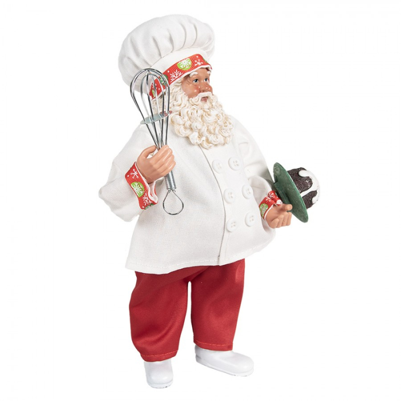 Bílá vánoční dekorace s motivem Santa Claus s kuchařskou čepicí držící dortík s polevou s metličkou je elegantní dekorací, která připomene ty nejkrásnější chvíle svátků. Tradiční vánoční motiv se stane středem pozornosti každého prostoru. Rozměr 27 cm je jako stvořený pro sezónní aranžmá. Potěší vás i vaše blízké svou milou podobou.
