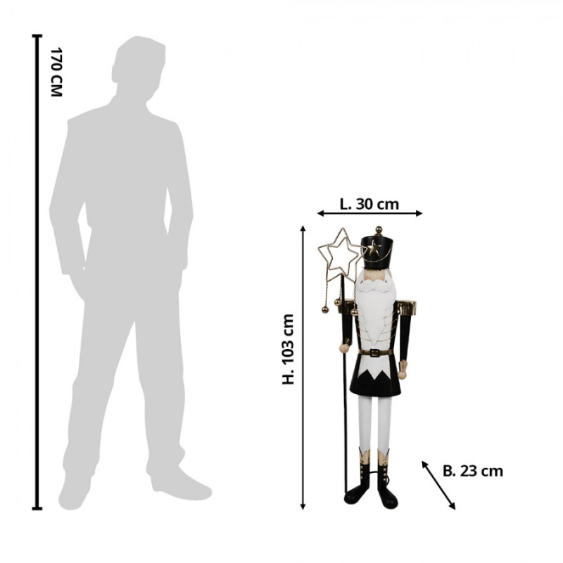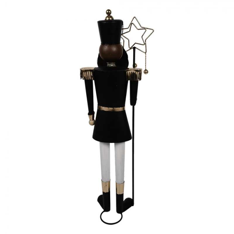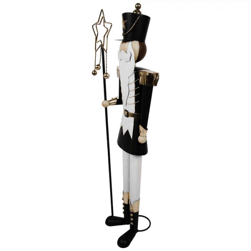 Černá kovová vánoční dekorace figurka s motivem Louskáček s bílými kalhotami a s ozdobnou holí s hvězdami je elegantní dekorací, která připomene ty nejkrásnější chvíle svátků. Tradiční vánoční motiv se stane středem pozornosti každého prostoru. Rozměr 30x23x103 cm je jako stvořený pro sezónní aranžmá. Potěší vás i vaše blízké svou milou podobou.