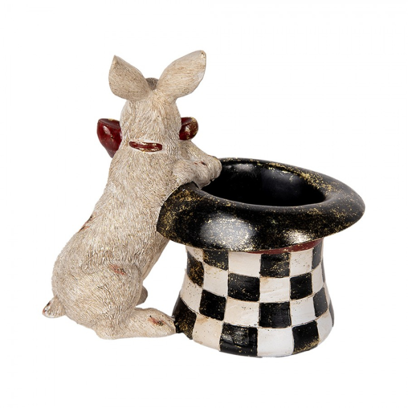 Dekorace ve vintage stylu bílý kouzelnický králík s kostkovaným kloboukem přitáhne pozornost každého milovníka designových detailů. Výrazné provedení a jemné linie tvoří harmonický celek. Rozměr 25x16x23 cm z ní dělá středobod každé dekorace. Skvělý tip na dárek nebo oživení interiéru.