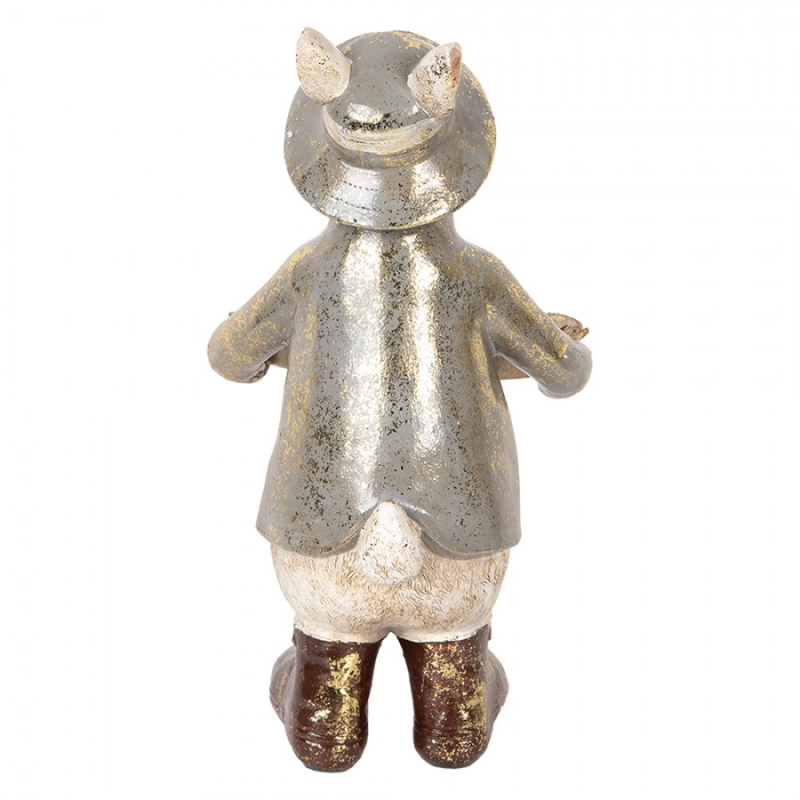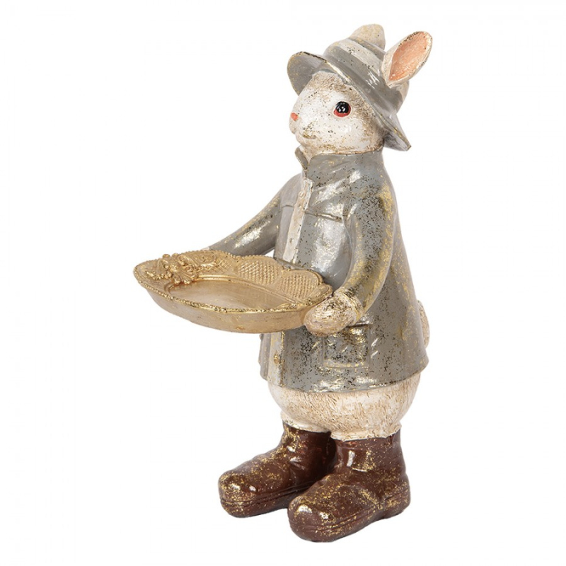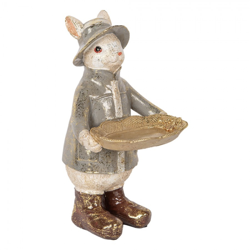 Dekorace ve vintage stylu bílý králík v šedé pláštěnce s klobouku s tácem dodá interiéru osobitý nádech a eleganci. Skvěle se hodí na komodu, polici nebo do okenního výklenku. Rozměr 29 cm je ideální pro výraznou, ale vkusnou prezentaci. Stylový doplněk pro váš domov i sezónní dekorace.