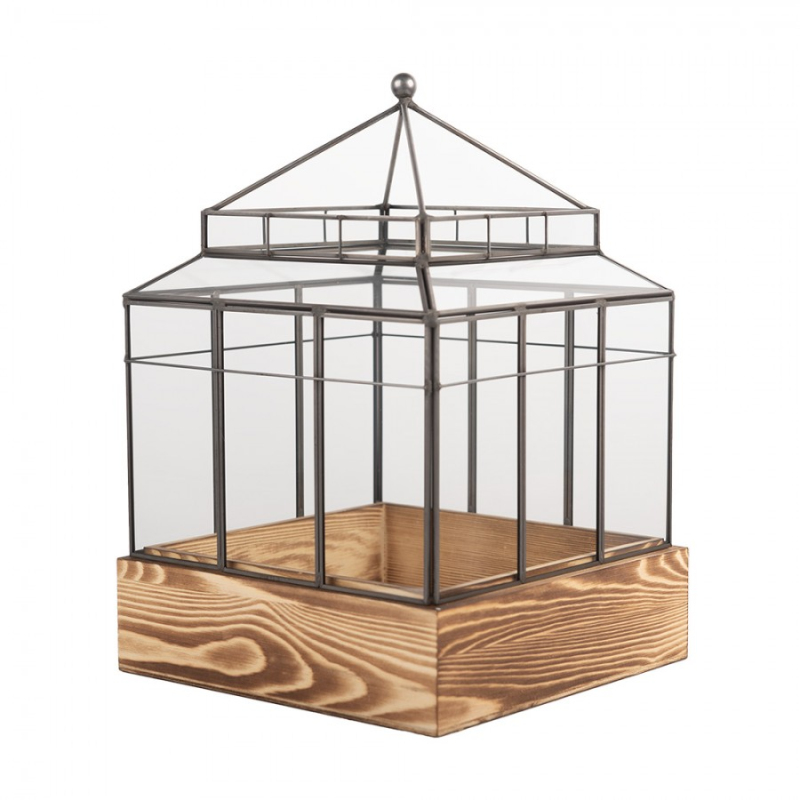 Skleněný poklop ve tvaru hranolu / domácí skleník s dřevěným tácem Kas – 14x14x24 cm