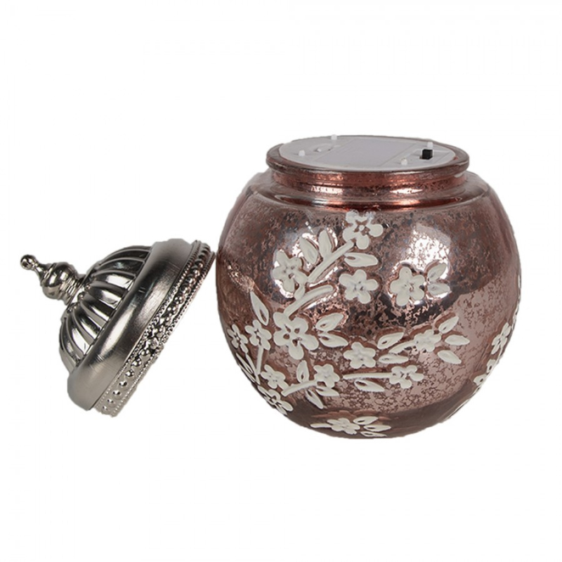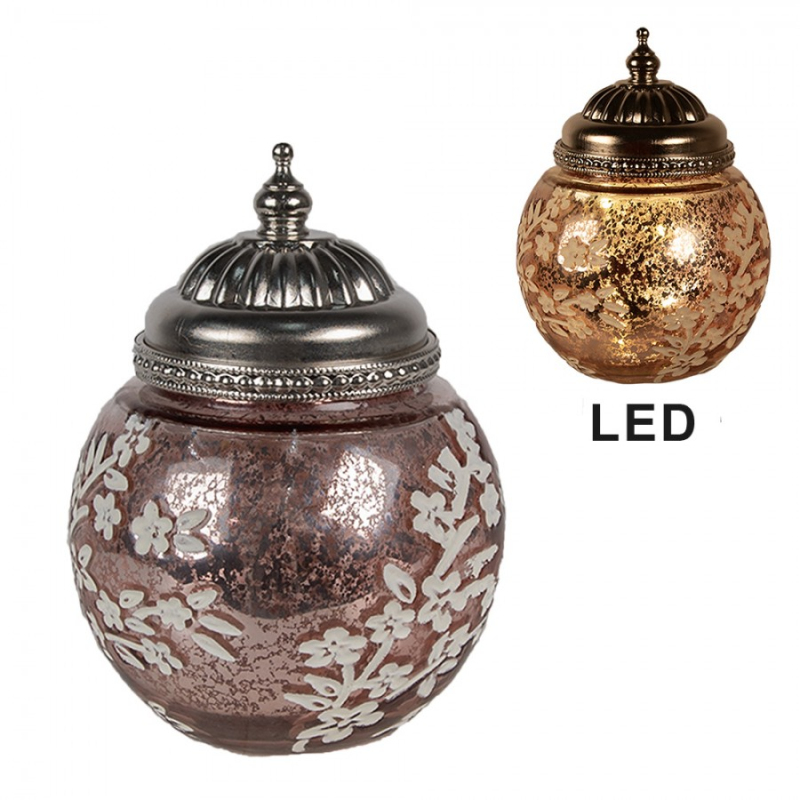 Hnědá skleněná dekorace lucerna s LED světlem s ozdobnými lístky – 8x19 cm