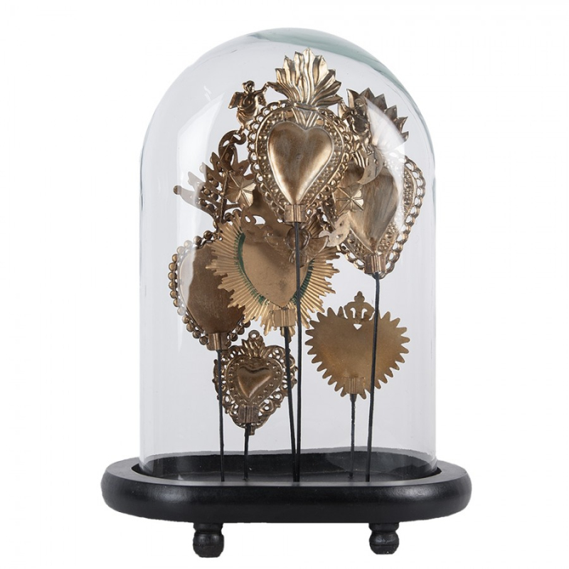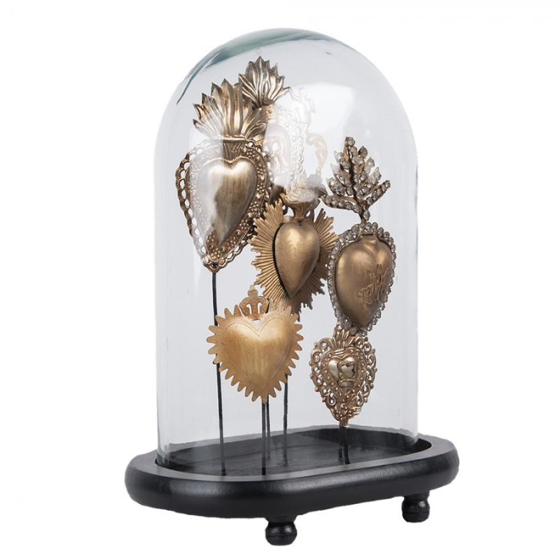 Skleněný poklop s černým dřevěným podnosem a okrasnými zlatými srdíčky je působivou dekorací, která zvýrazní každý detail vystavený pod sklem. Elegantní spojení skleněného poklopu a dekorativního podnosu tvoří harmonický celek. Rozměr 27x18x39 cm nabízí dostatek prostoru pro svíčky, figurky nebo sezónní ozdoby. Stylový doplněk do vintage i moderních interiérů.