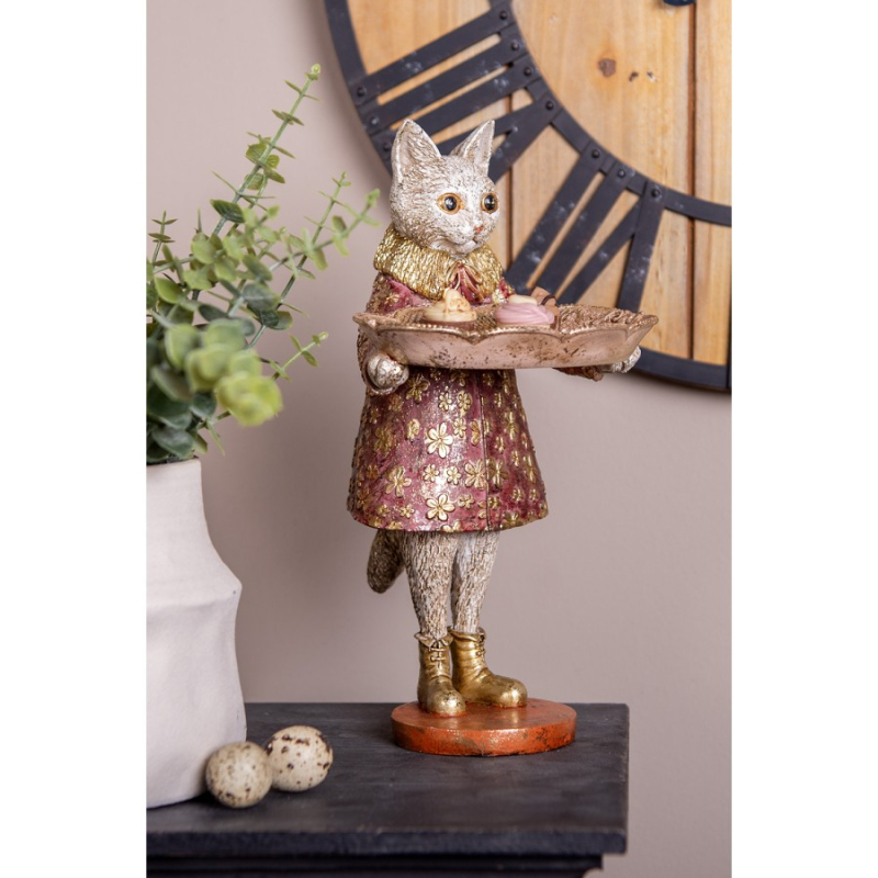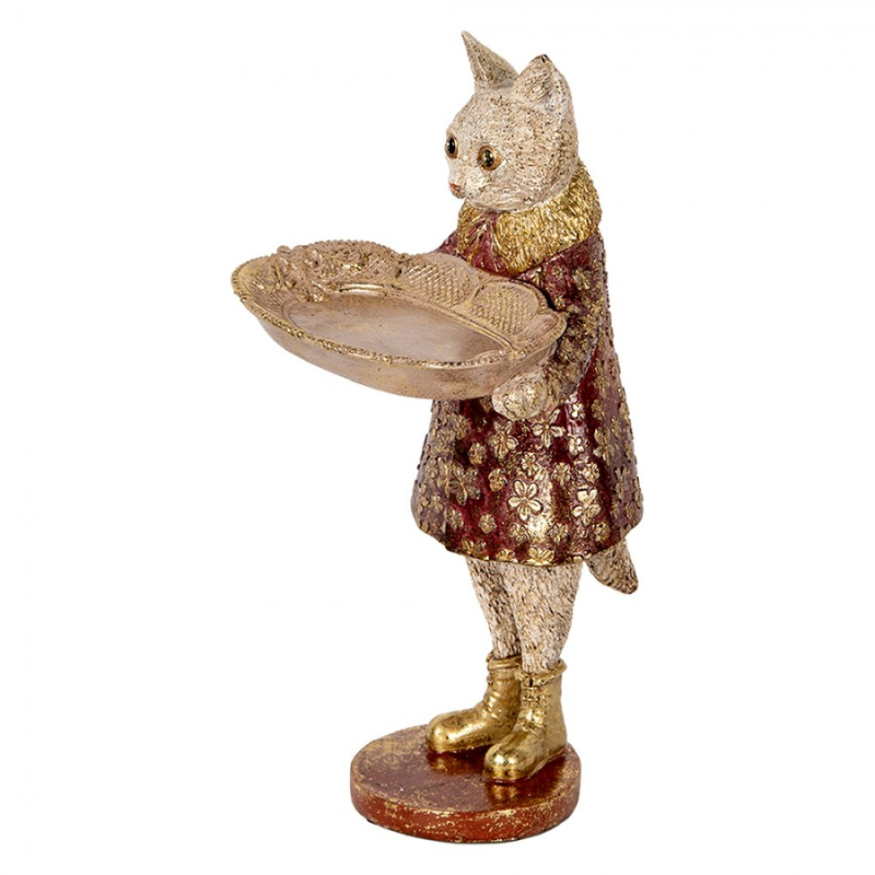 Vintage dekorace bílá kočka s tácem a zlatou patinou dodá interiéru osobitý nádech a eleganci. Skvěle se hodí na komodu, polici nebo do okenního výklenku. Rozměr 27 cm je ideální pro výraznou, ale vkusnou prezentaci. Stylový doplněk pro váš domov i sezónní dekorace.